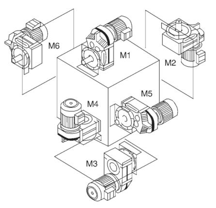 محرك مثبت أفقيًا M1، قاعدة الوحدة في الأسفل. يتم تركيب محرك M2 عموديًا للأسفل. محرك مثبت أفقيًا M3، قاعدة الوحدة في الأعلى. يتم تركيب محرك M4 عموديًا للأعلى. محرك مثبت أفقيًا M5، إذا تم وضعه على موضع M1، على الجانب الأيسر تتحول الوحدة إلى الأسفل (نقطة الرؤية: نحو جانب المحرك). محرك مثبت أفقيًا M6، إذا تم وضعه على موضع M1، على الجانب الأيسر منه تتحول الوحدة إلى الأعلى (نقطة الرؤية: نحو جانب المحرك). | ![]() |